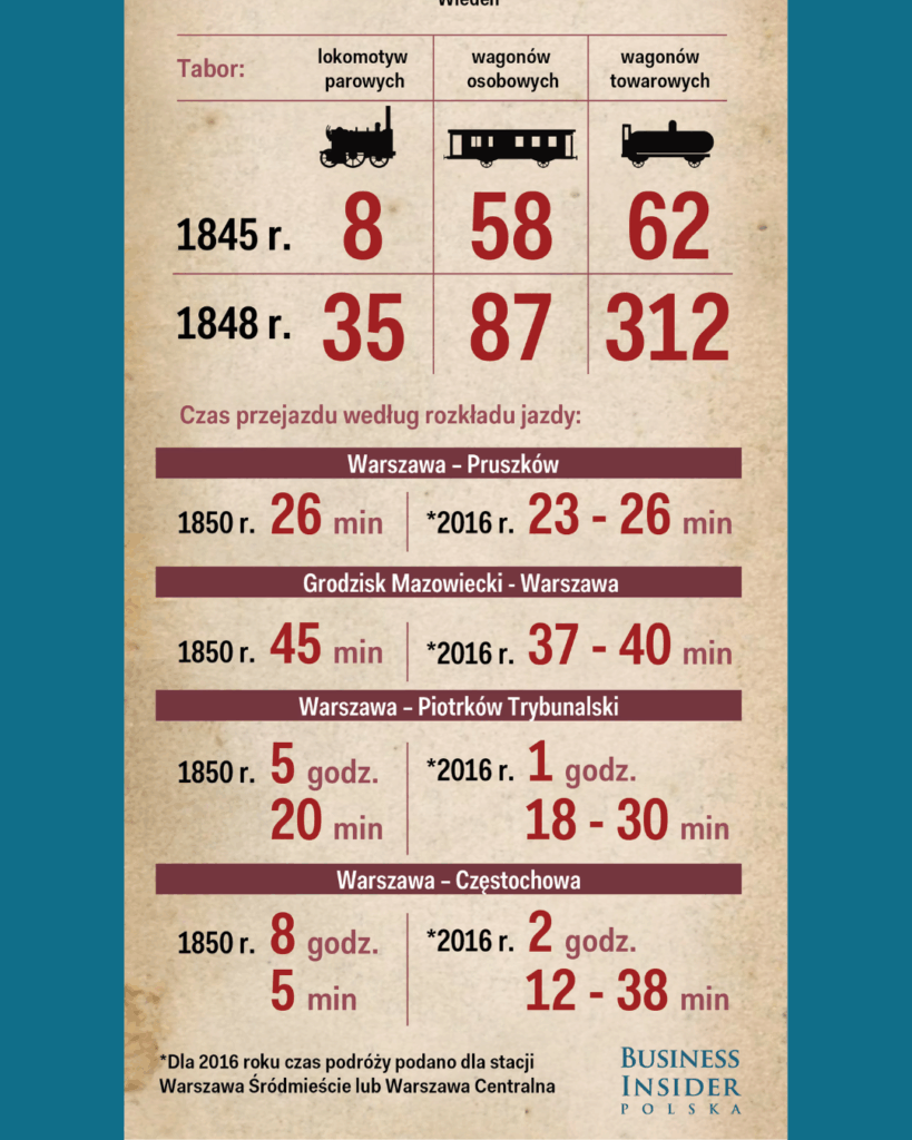 Źródło grafik ze statystyką: „171 lat temu na tory wyjechał pierwszy polski pociąg. Ile wtedy trwała podróż?” w Business Insider Polska, 14.06.2016